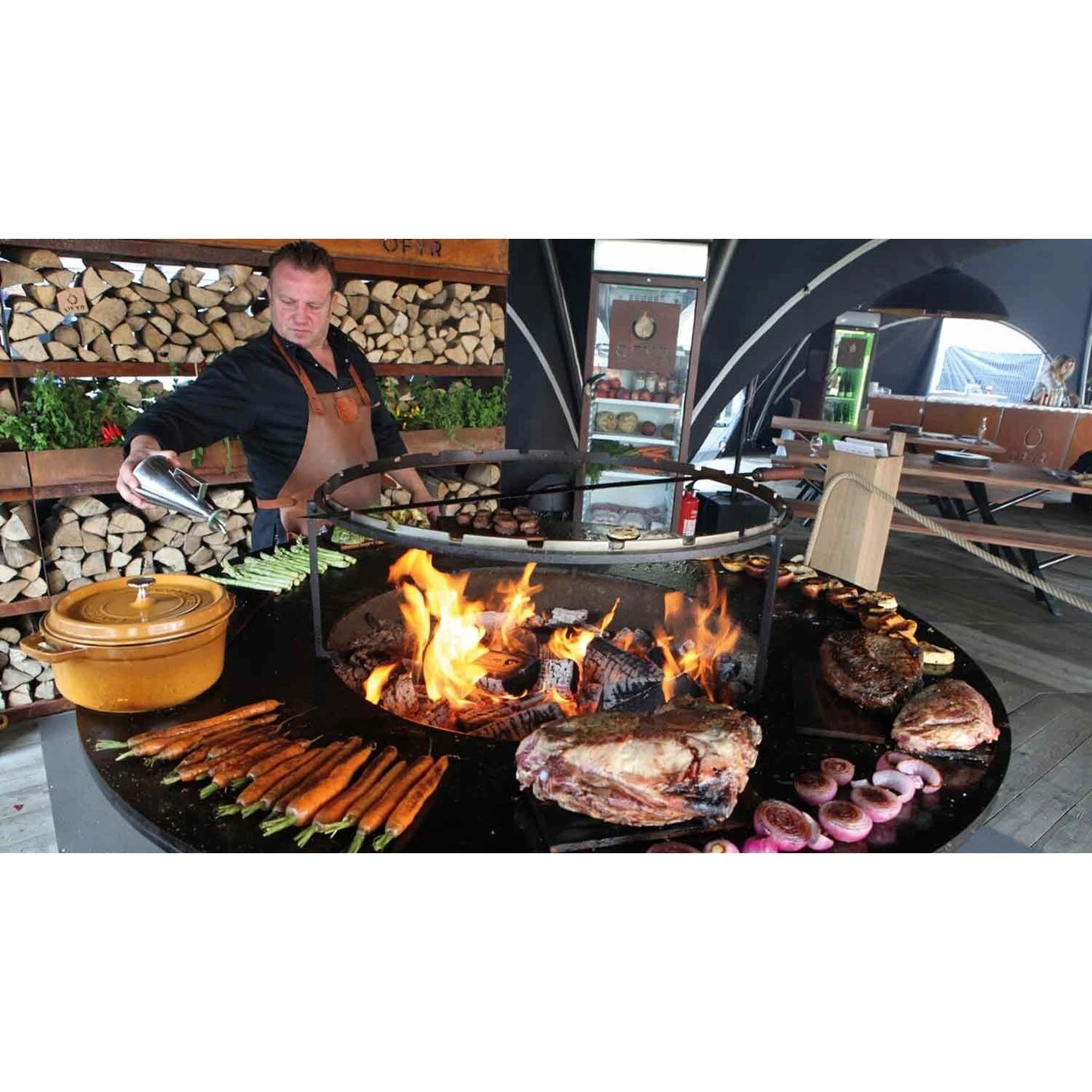 - 1 grille ronde avec son trépied (ø 76 cm) pour griller à la flamme de grosses pièces de viandes ou poser des poêles et casseroles au dessus du feu.